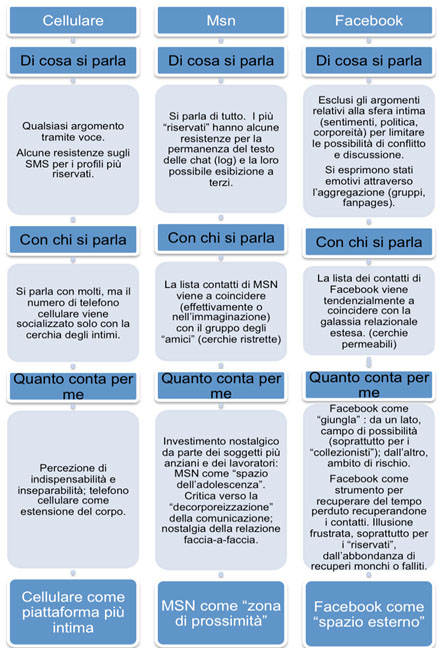 I significati attribuiti dai giovani alle tecnologie emergono all’intersezione tra: le politiche discorsive (“di cosa si parla” in ciascuna piattaforma), le politiche di accesso (“chi è contattabile” tramite ciascuna piattaforma)el’investimento simbolico (“quanto conta per me ciascuna piattaforma”). Queste tre direttrici interagiscono nel dar forma a un’attribuzione centrale: quella di intimità (e a loro volta vi trovano conferma).