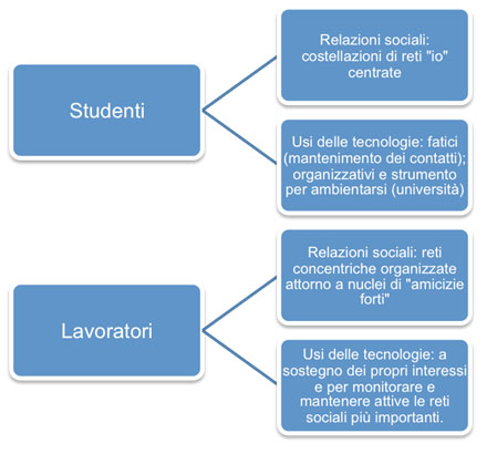 Studenti e lavoratori, in primo luogo presentano una diversa organizzazione delle reti sociali d’appartenenza. Mentre gli studenti appaiono ancora pienamente orientati a una fase esplorativa ed estensiva delle proprie reti di relazioni, i lavoratori presentano forme di organizzazione più “consolidate”.